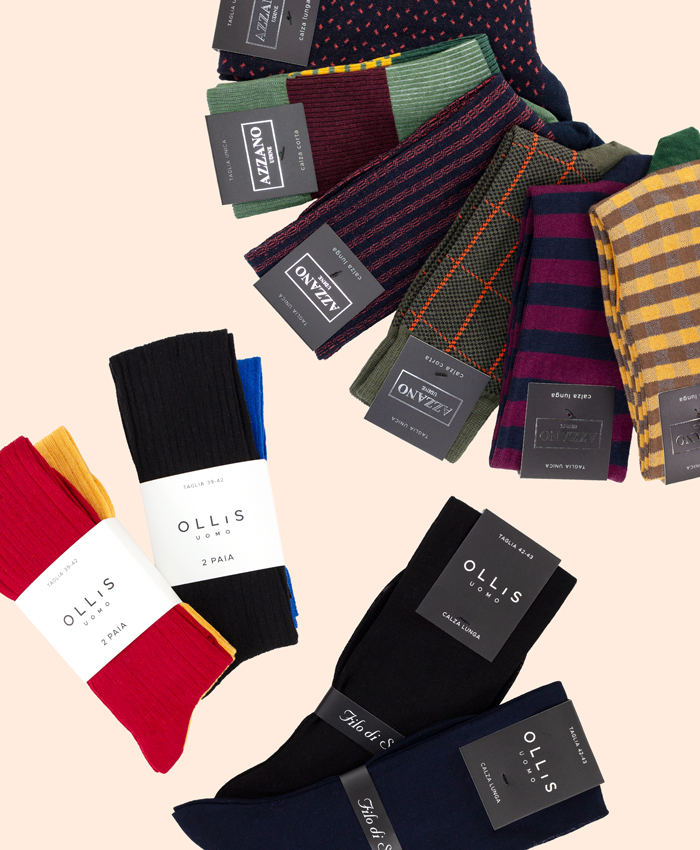 Se in giro ti capita di imbatterti in calzini dal packaging semplice brandizzati Ollis e Azzano Udine, allora ci hai trovato!! Questi sono i principali marchi di Azzano Calze. Rispettivamente la nostra linea basica dalle fantasie e dai colori sobri e la nostra gamma più colorata e di carattere.